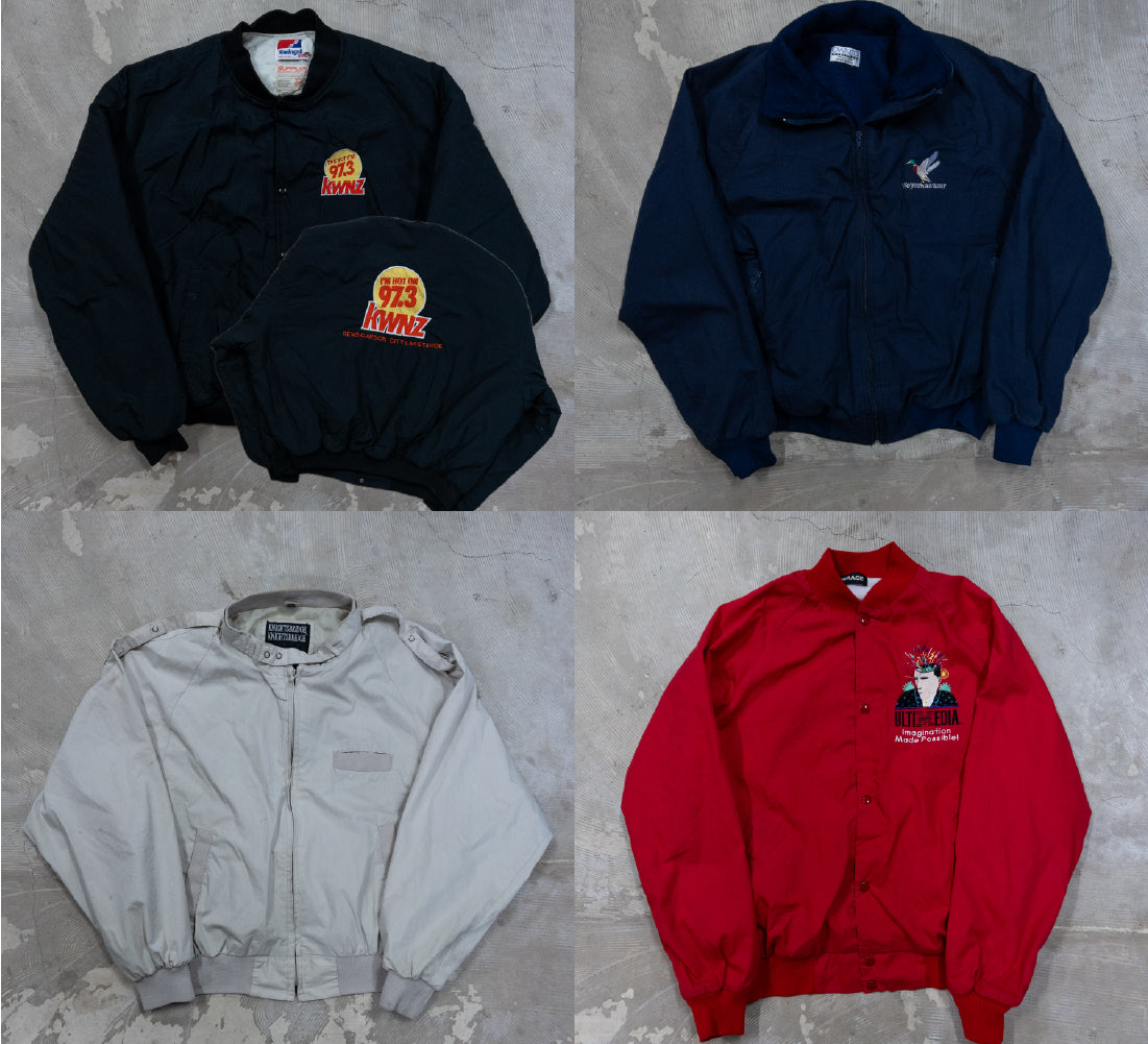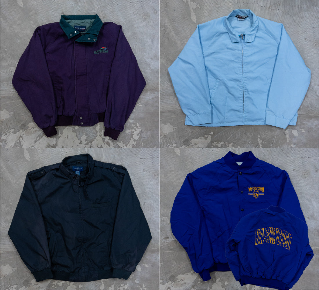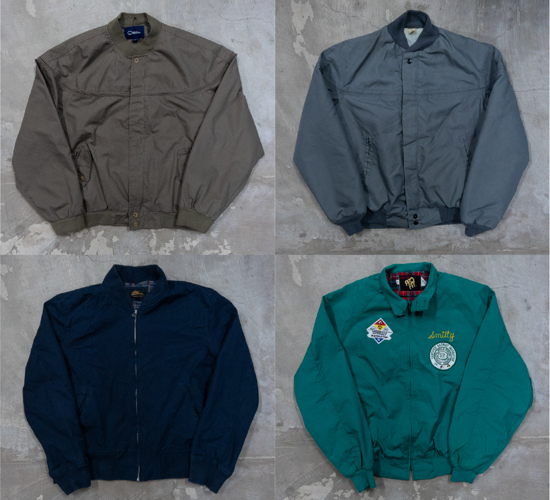 90年代のウォームアップジャケット、ダービージャケット、ドリズラージャケット、MA-1、スウィングトップ、スタジャンなど、軽アウターを中心に構成された約60枚ベール。