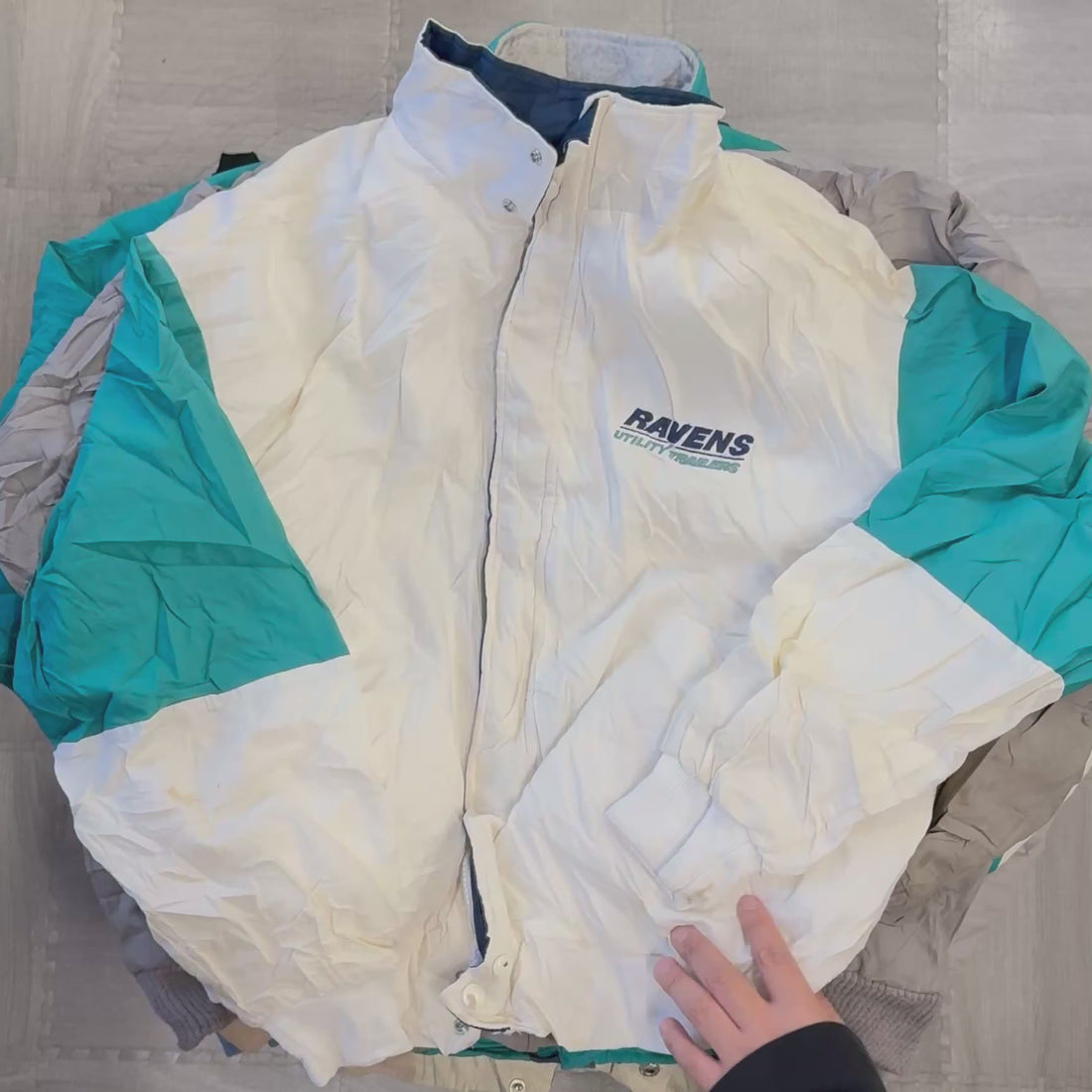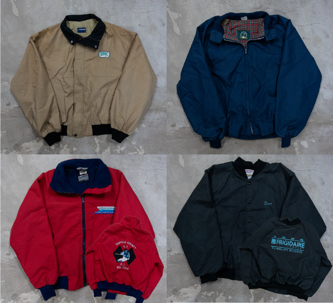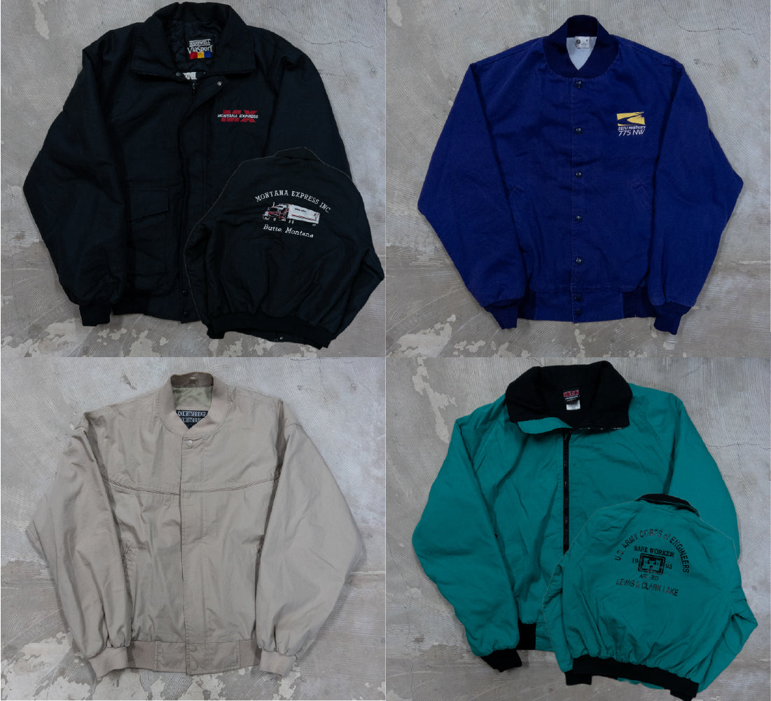 90年代のウォームアップジャケット、ダービージャケット、ドリズラージャケット、MA-1、スウィングトップ、スタジャンなど、軽アウターを中心に構成された約60枚ベール。